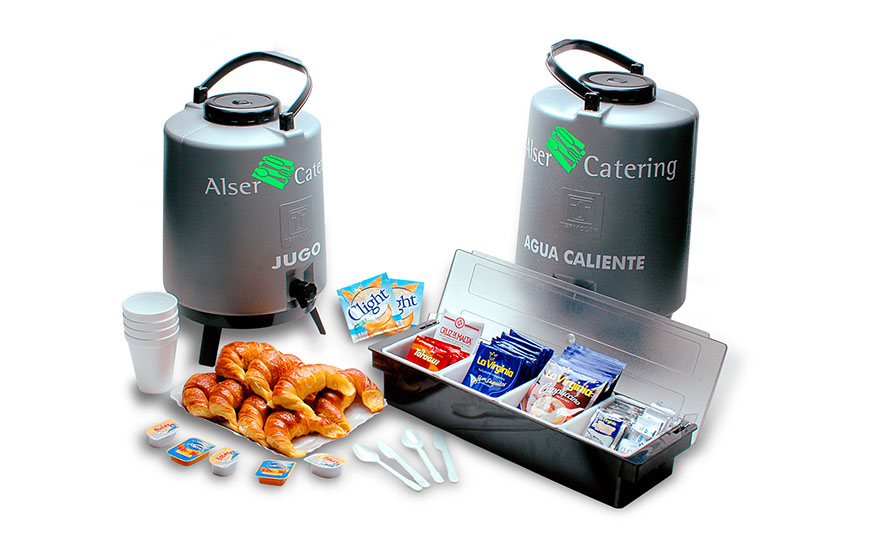 café, te, mate cocido, leche, agua mineral, jugo de naranja, medias lunas, facturas, vajilla descartable.