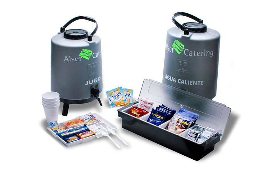 café, te, mate cocido, leche, agua mineral, jugo de naranja, medias lunas, facturas, mini pbt, negritos, sacramentos, vajilla descartable.