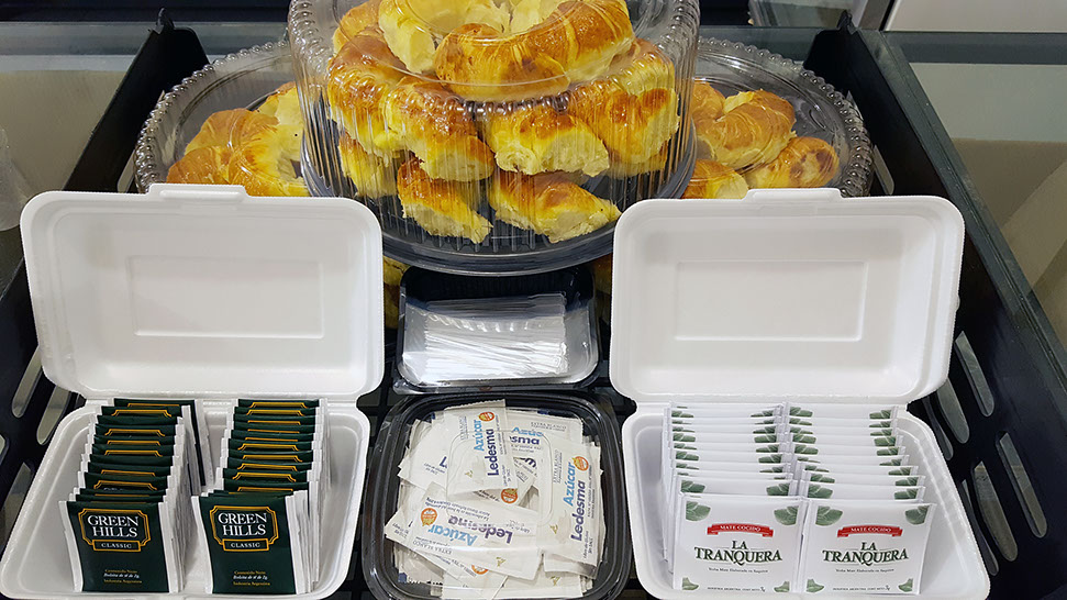 café, te, mate cocido, leche, agua mineral, jugo de naranja, medias lunas, facturas, mini pbt, negritos, sacramentos, vajilla descartable.